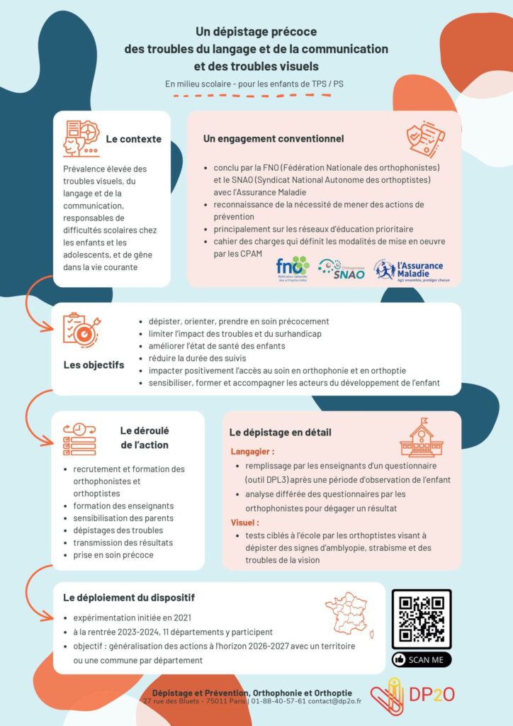 Les dépistages se font au sein des classes de petite section de maternelle, dans les écoles publiques et privées. Le dépistage des troubles du langage et de la communication se décline selon le protocole DPL3 :