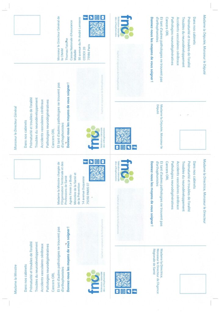 à donner à nos proches, notre entourage, nos patients pour qu’ils puissent les envoyer, eux-aussi, en apposant, par exemple, dans la case prévue pour le cachet de l’orthophoniste, le message suivant : JE SOUTIENS LES ORTHOPHONISTES et DEMANDE LA REVALORISATION de leur AMO !
